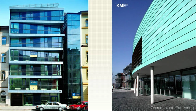 ■成份:無氧純銅為環保建材,非一般工業用銅。 ■表面變化的特色:表面色澤隨著氣候的變化,逐漸形成氧化層,長達百年以上的變化過程中,不同階段產生的表面色澤轉變正是銅材質魅力所在,使建築物擁有與時間共同